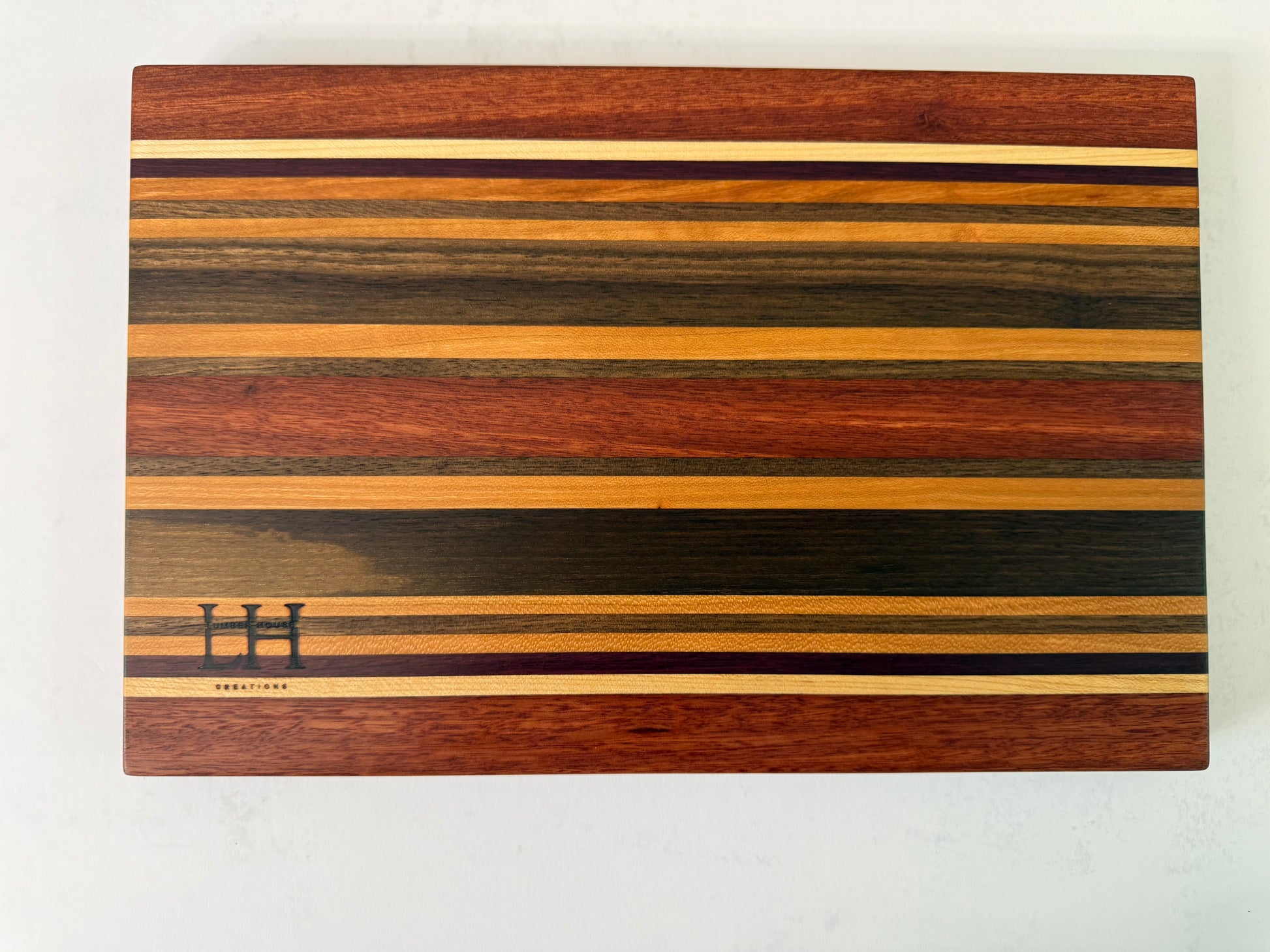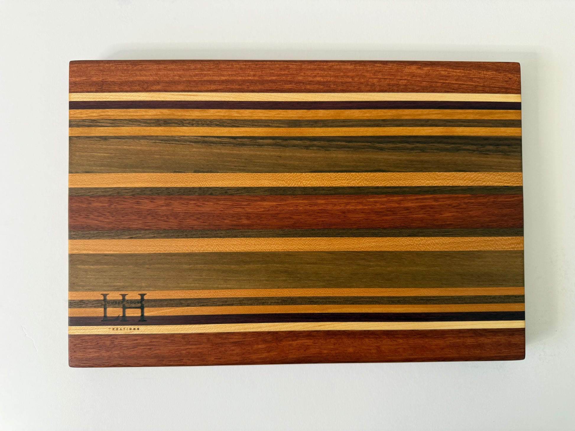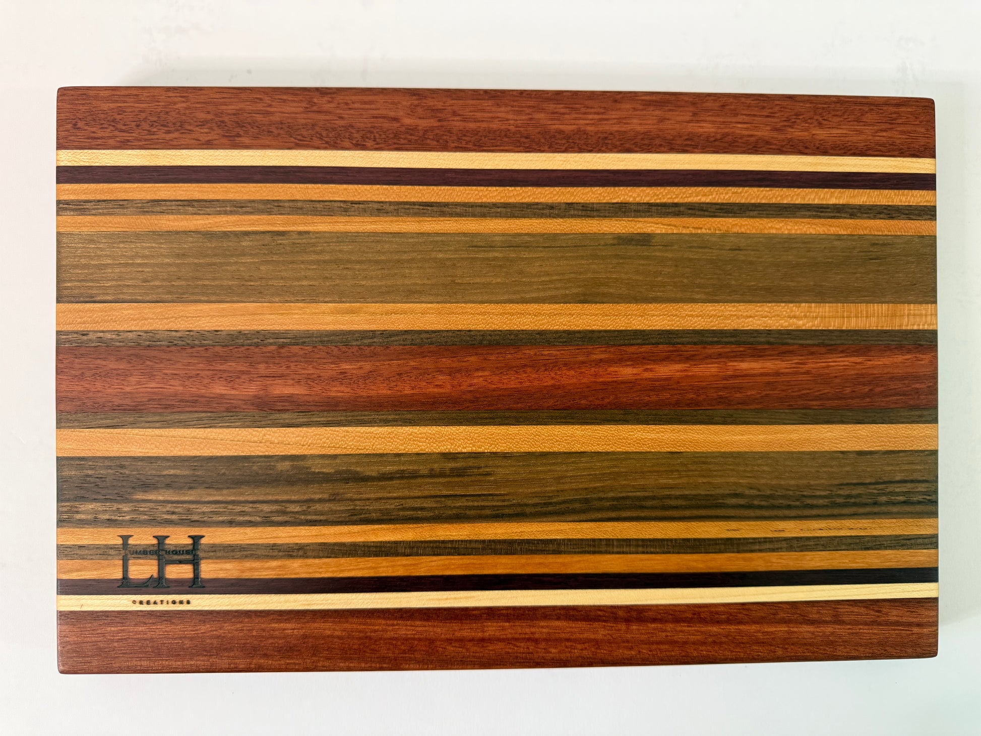 Each board is a unique work of art, showcasing the vibrant colors and textures of premium hardwoods. Perfect for home chefs or as a thoughtful, handcrafted gift.