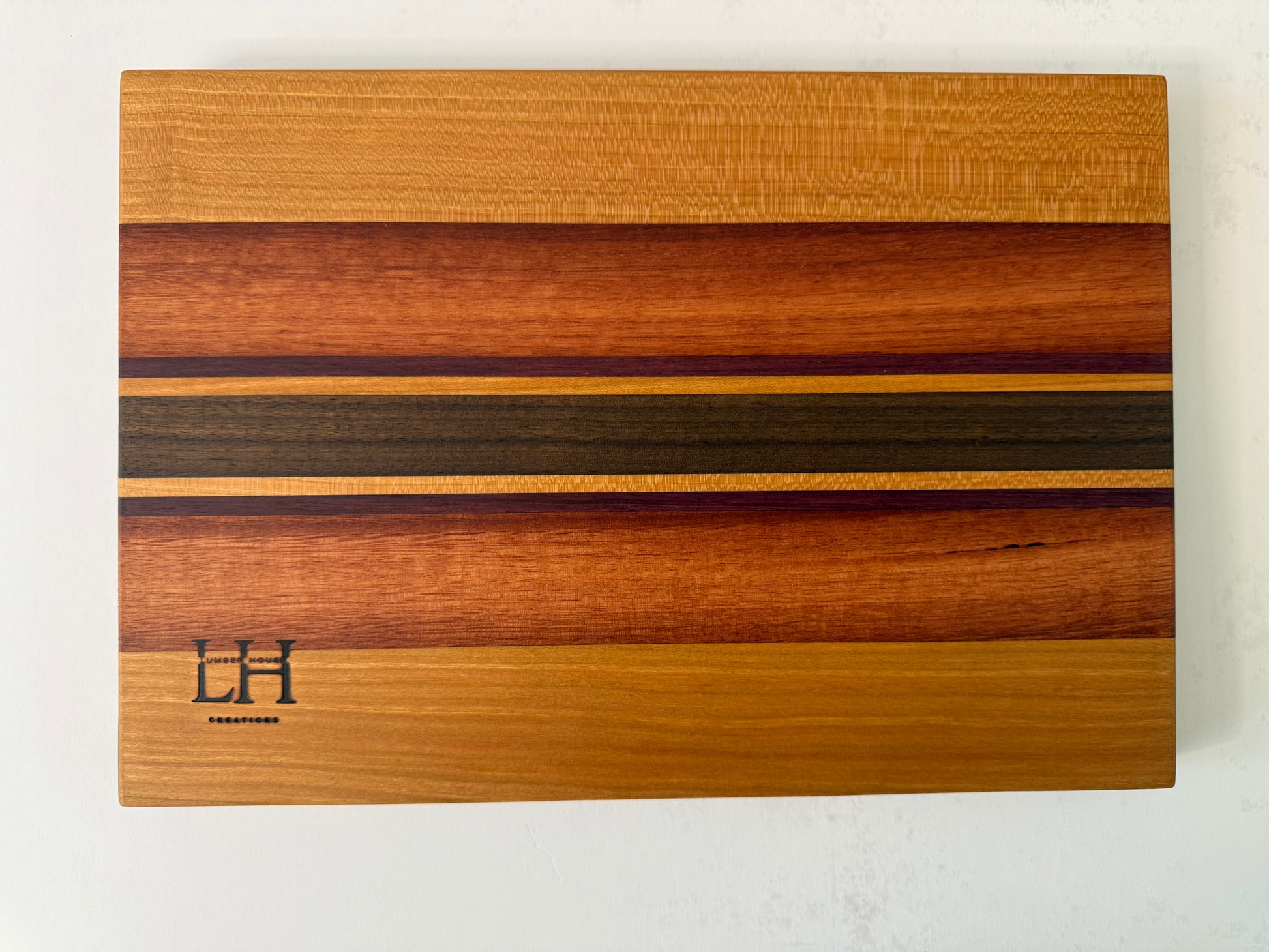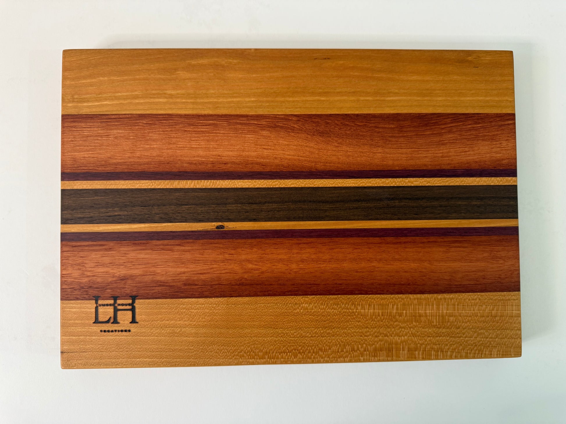 Each board is a unique work of art, showcasing the vibrant colors and textures of premium hardwoods. Perfect for home chefs or as a thoughtful, handcrafted gift.