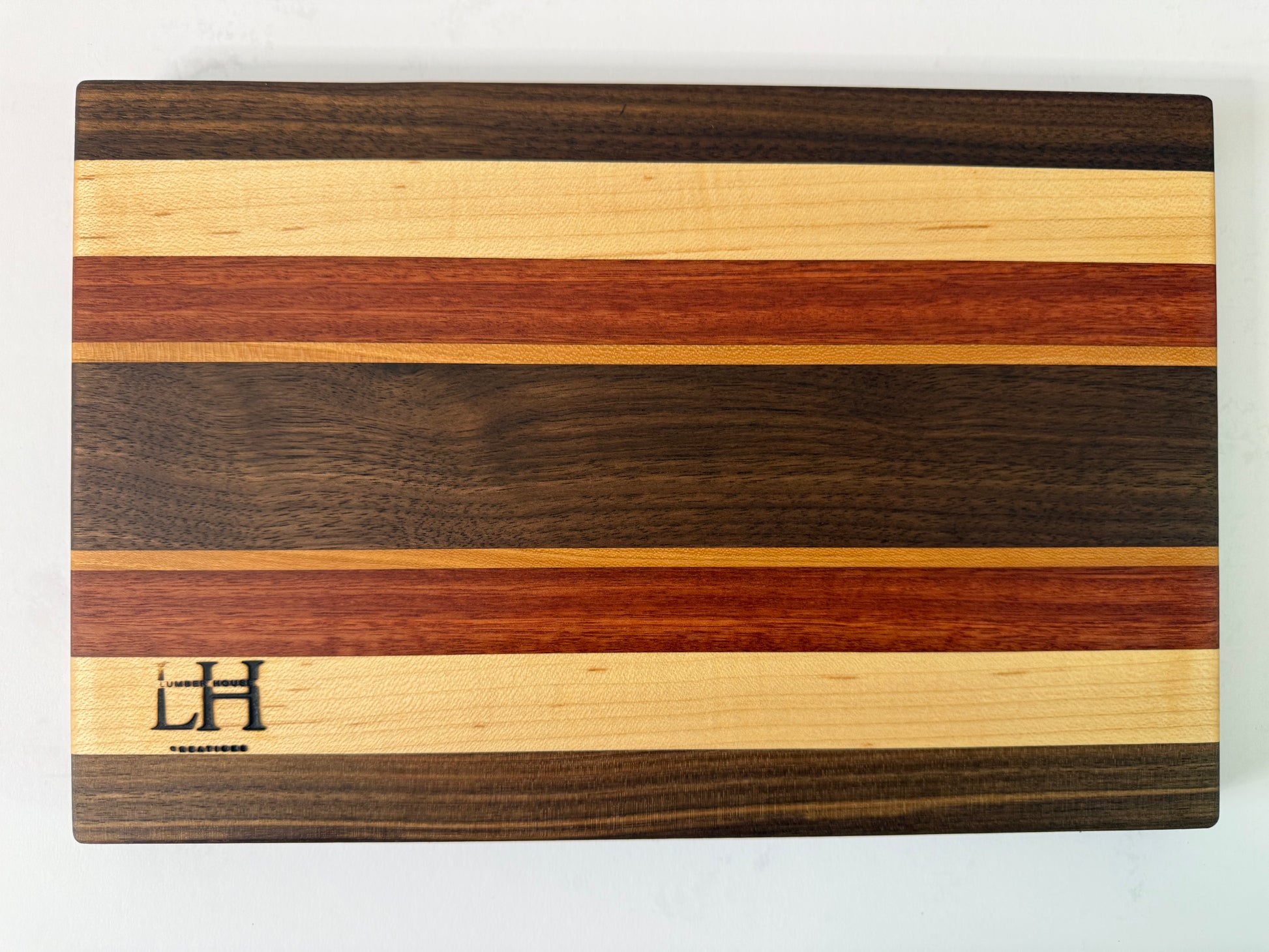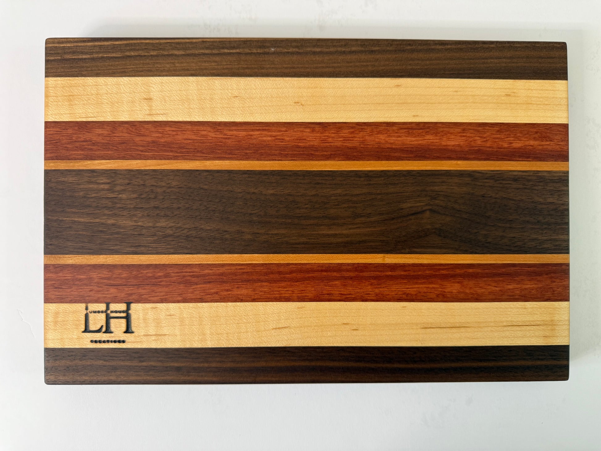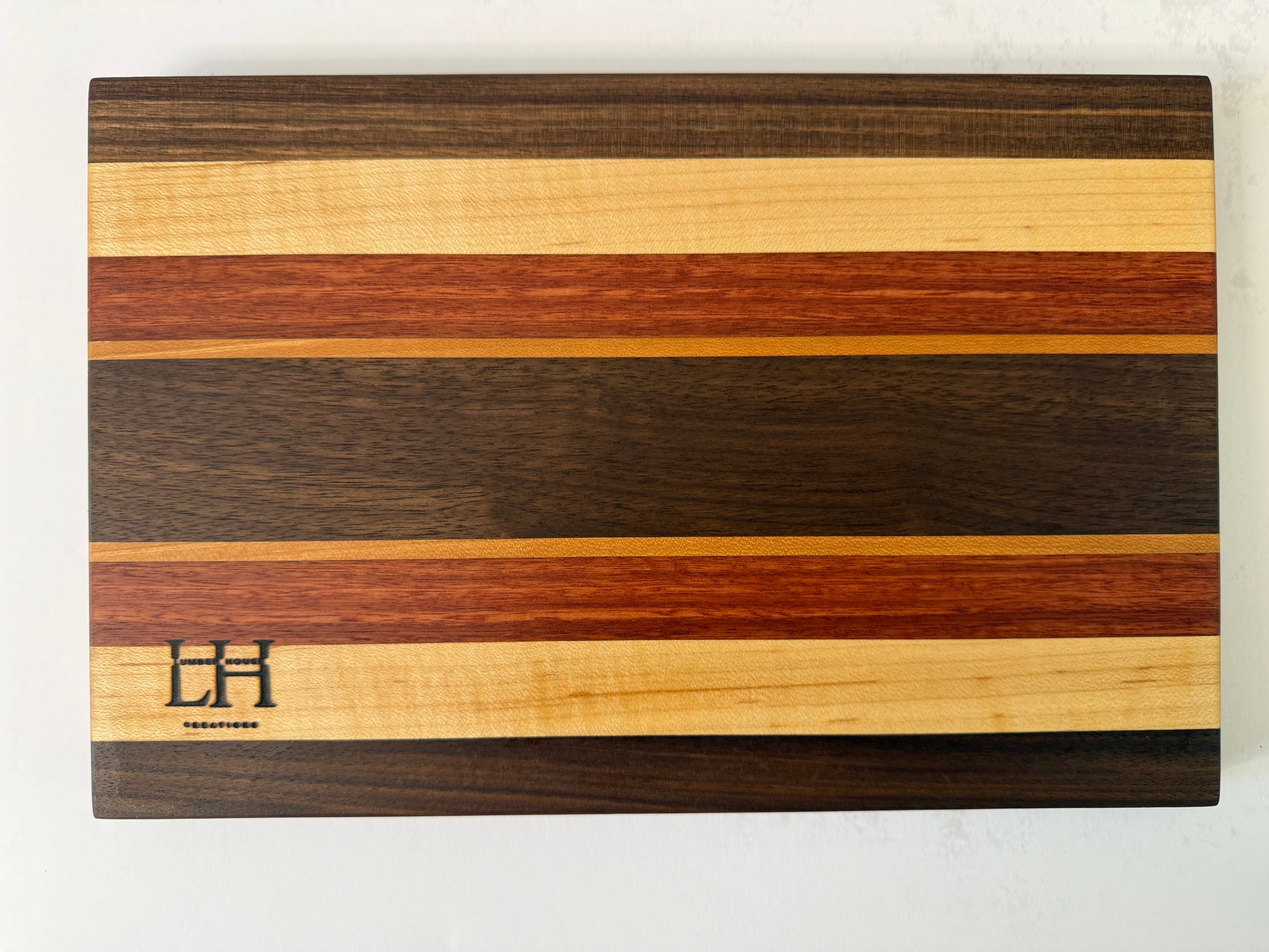 Each board is a unique work of art, showcasing the vibrant colors and textures of premium hardwoods. Perfect for home chefs or as a thoughtful, handcrafted gift.