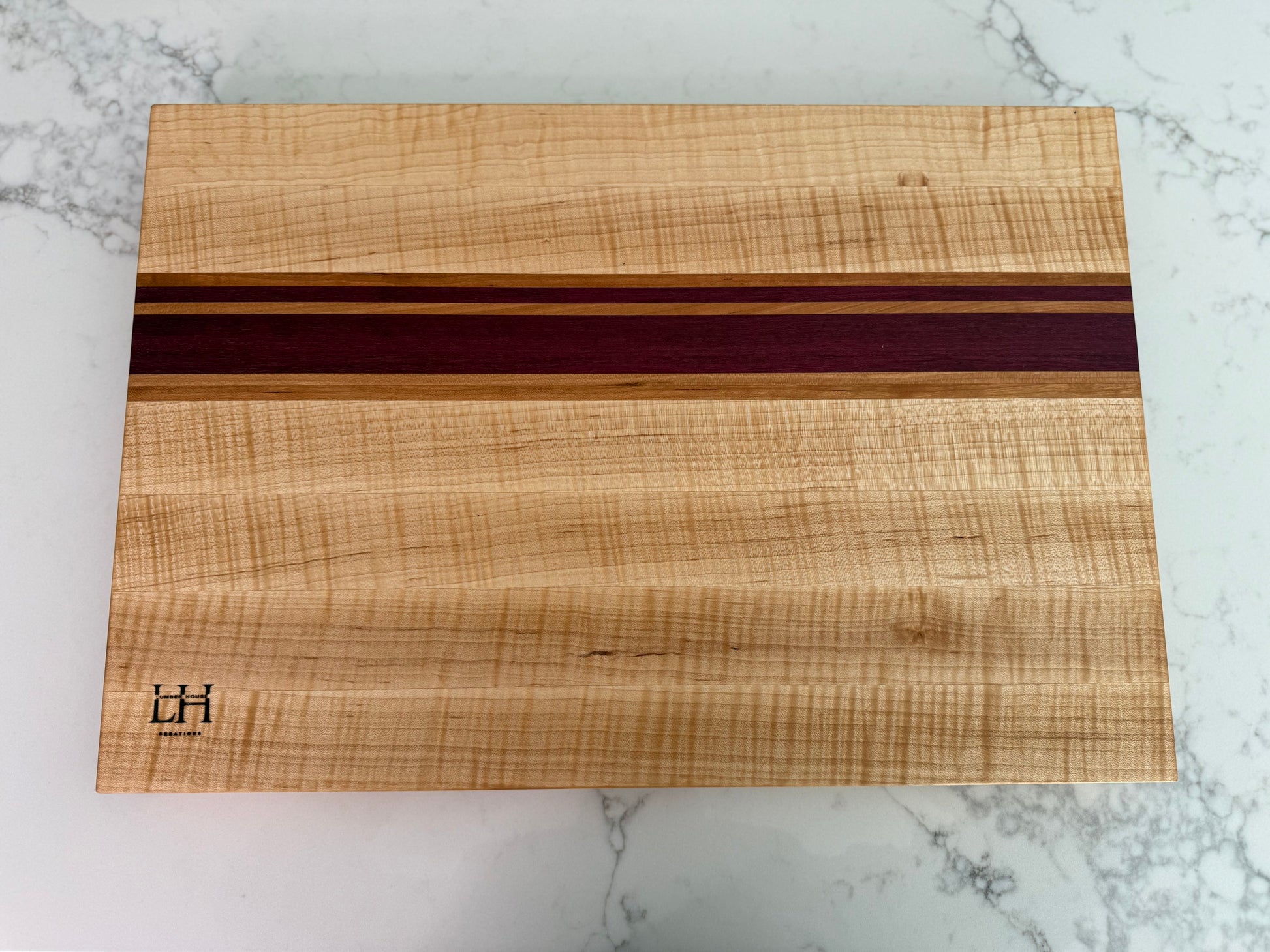 Elevate your kitchen with this beautifully handcrafted cutting board made primarily from premium maple, accented with rich cherry and striking purpleheart hardwoods. The clean, light tones of maple offer a classic look and exceptional durability, while the contrasting cherry and purpleheart stripes add warmth and a bold visual touch.