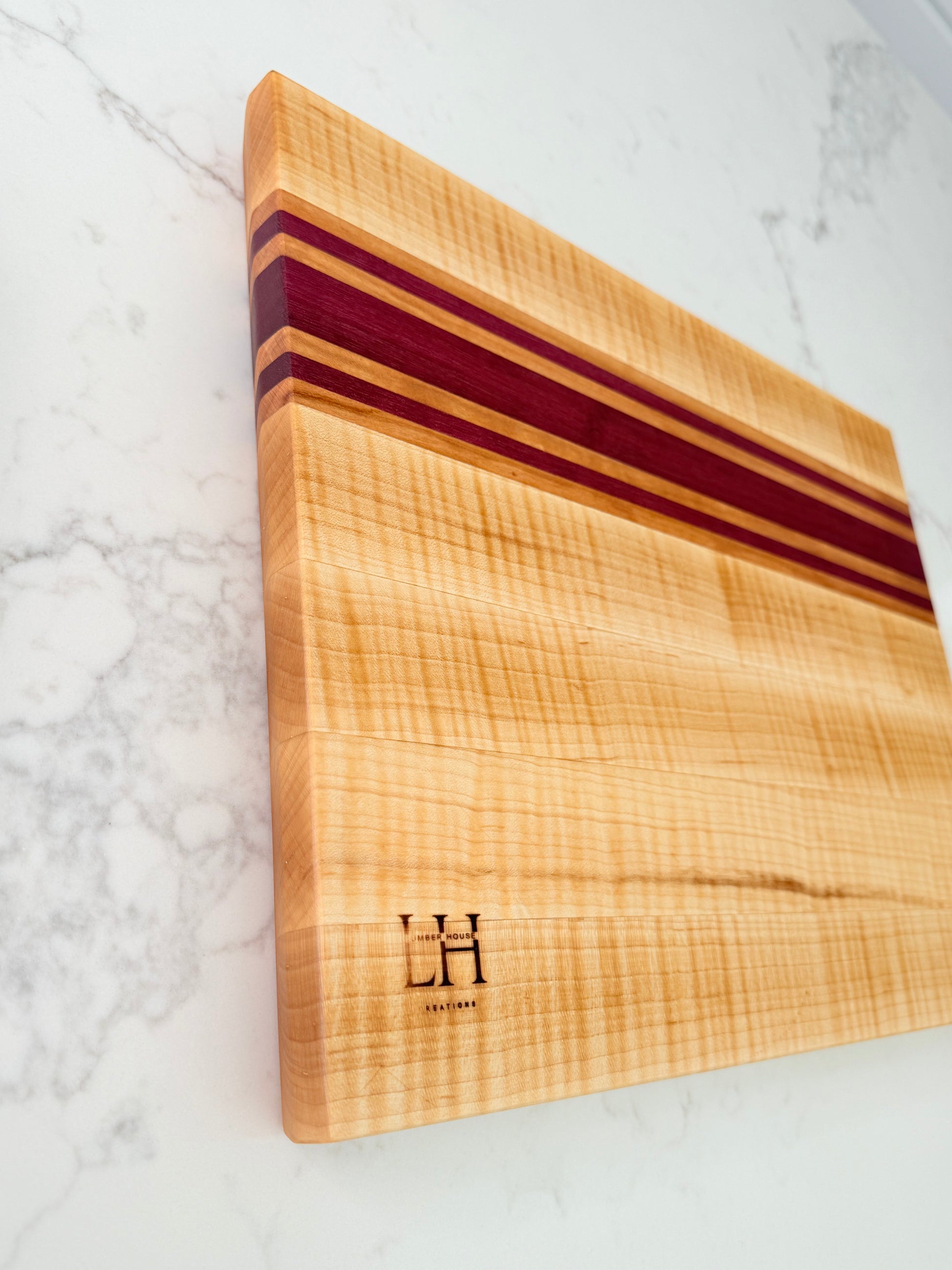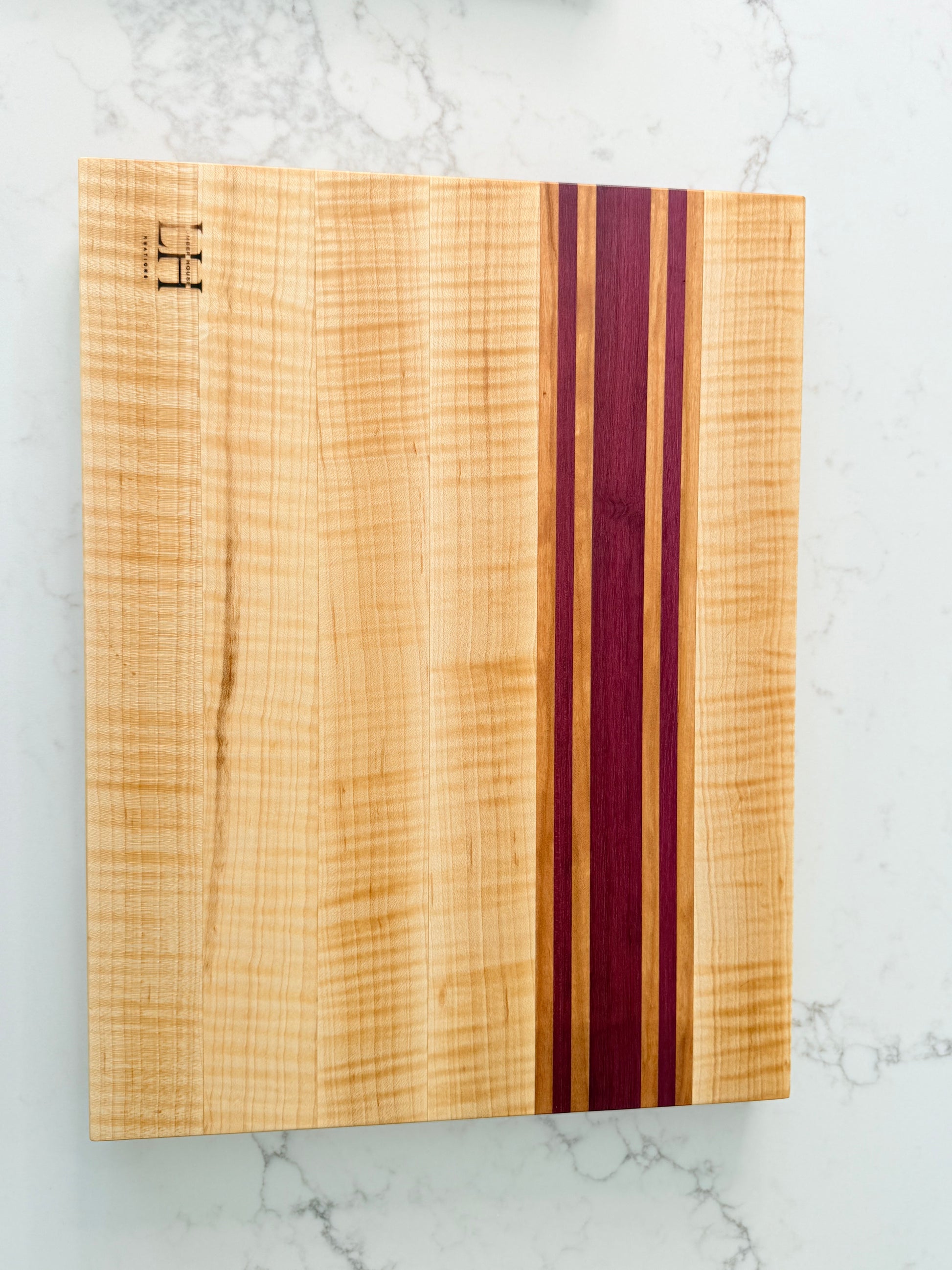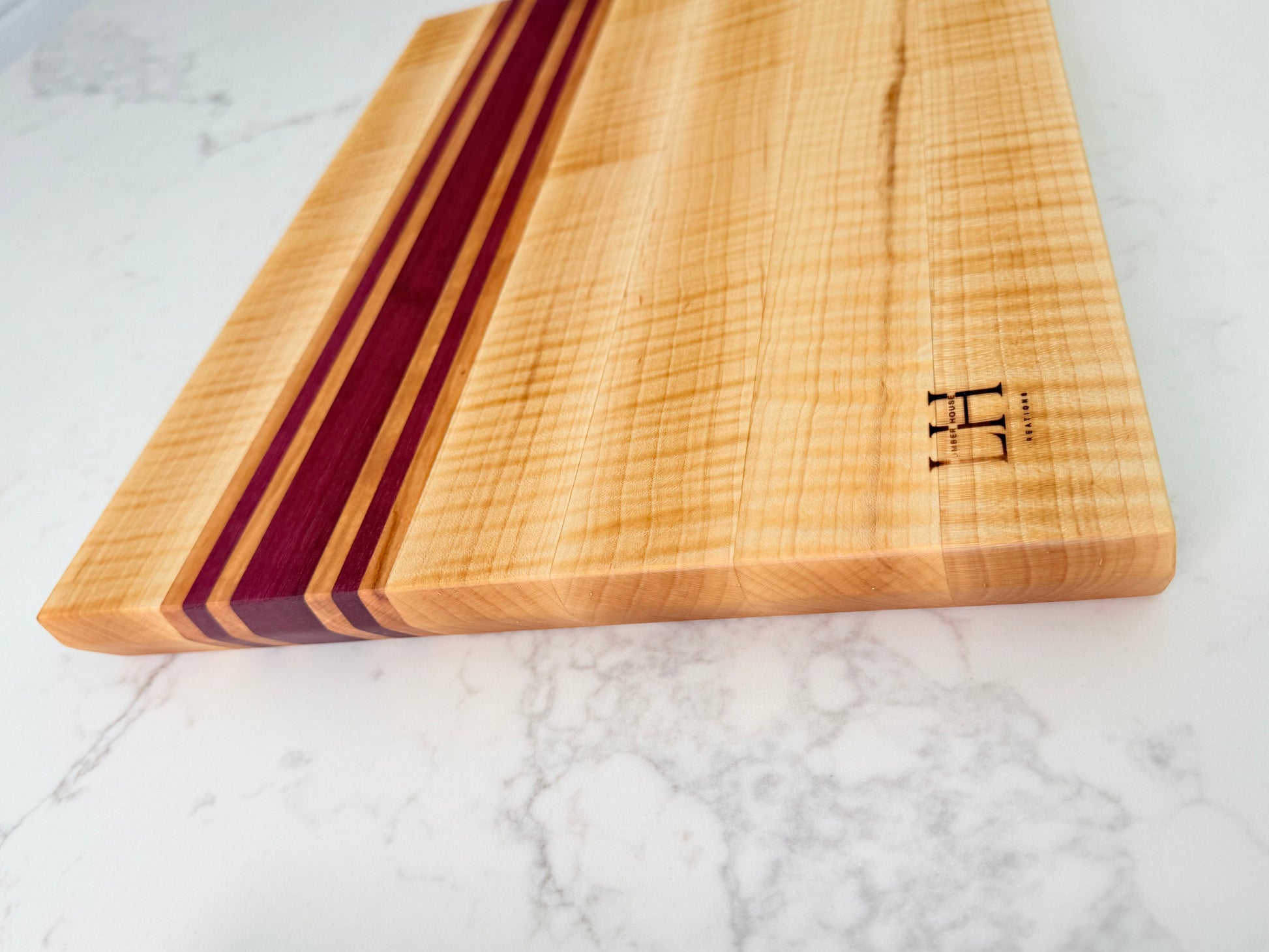 Elevate your kitchen with this beautifully handcrafted cutting board made primarily from premium maple, accented with rich cherry and striking purpleheart hardwoods. The clean, light tones of maple offer a classic look and exceptional durability, while the contrasting cherry and purpleheart stripes add warmth and a bold visual touch.