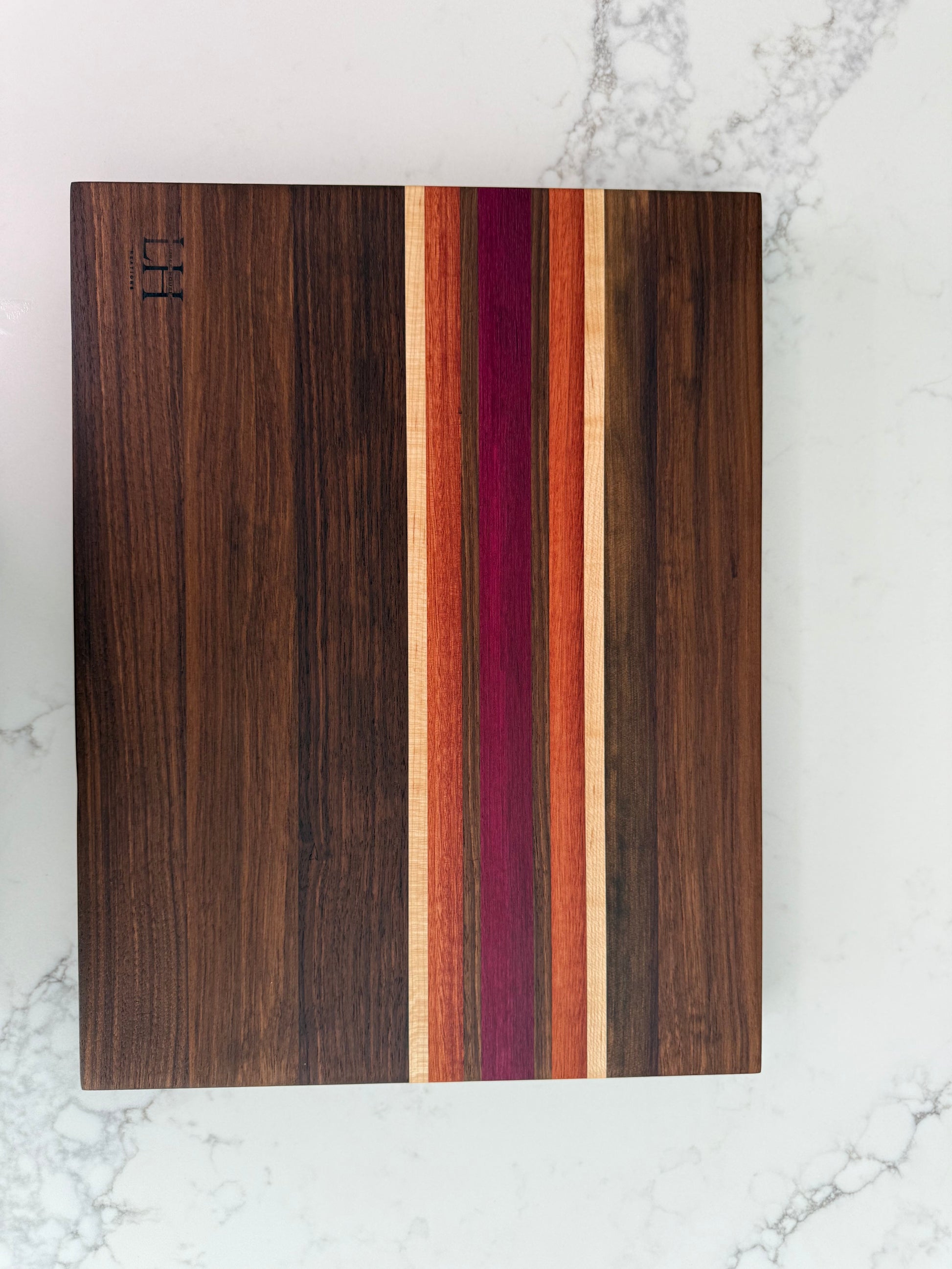 this handcrafted cutting board showcases the deep, rich tones of walnut as the primary wood, offering a bold and timeless foundation. Carefully balanced with light maple, warm cherry, and vibrant purpleheart accents, each board is a unique blend of color, grain, and character.